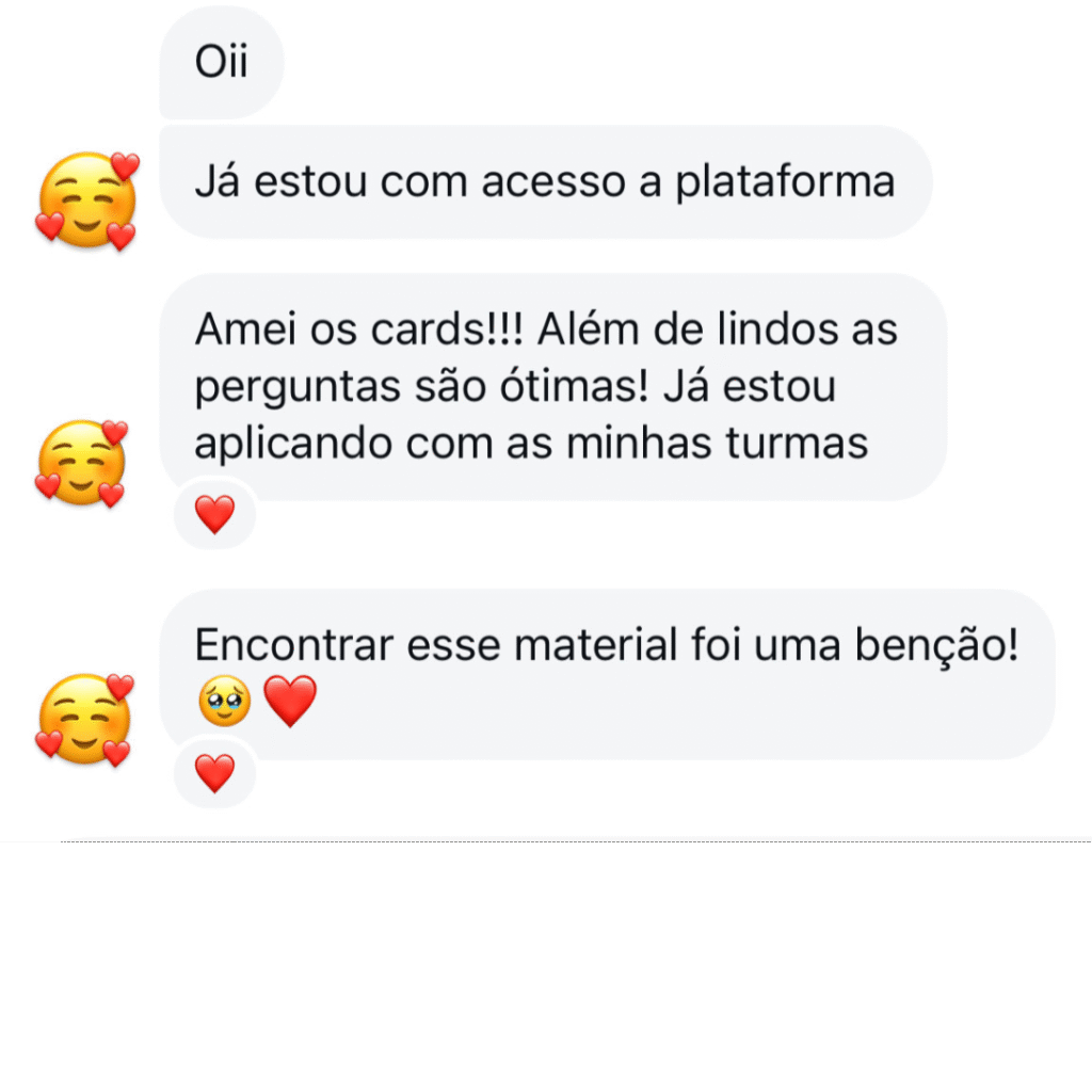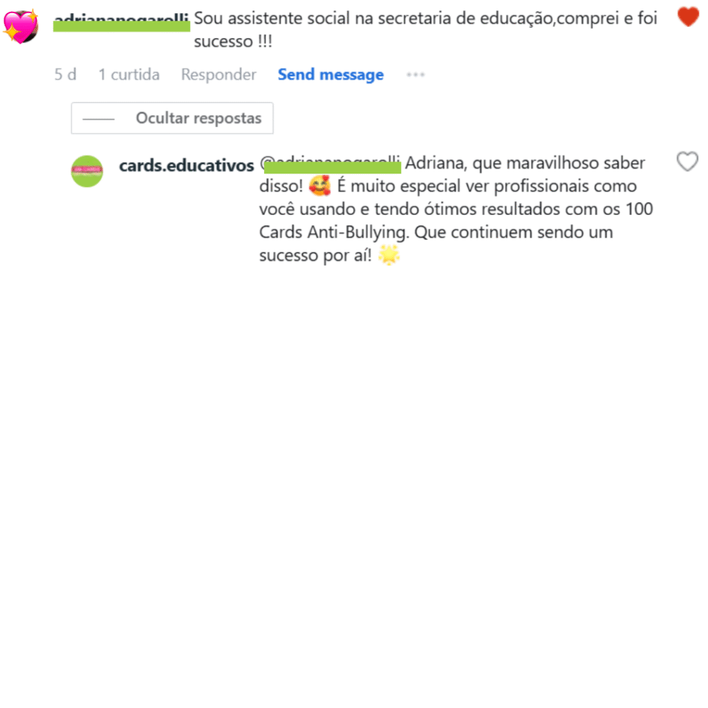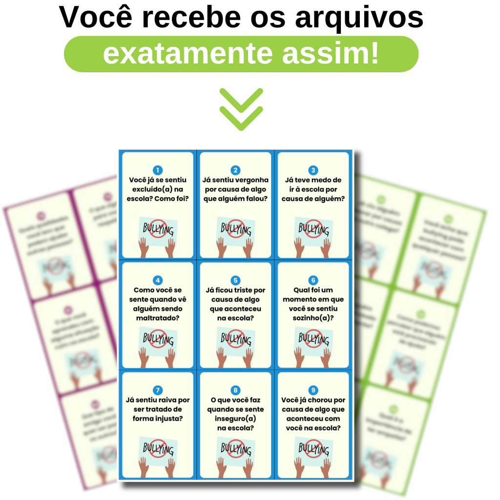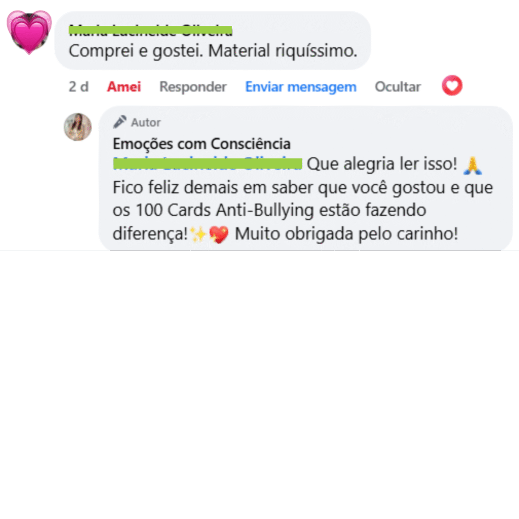 Acreditamos tanto na qualidade do “100 Cards Anti-Bullying” que você tem 7 dias para experimentar sem riscos. Se não fizer sentido pra você, devolvemos seu dinheiro. Simples assim.